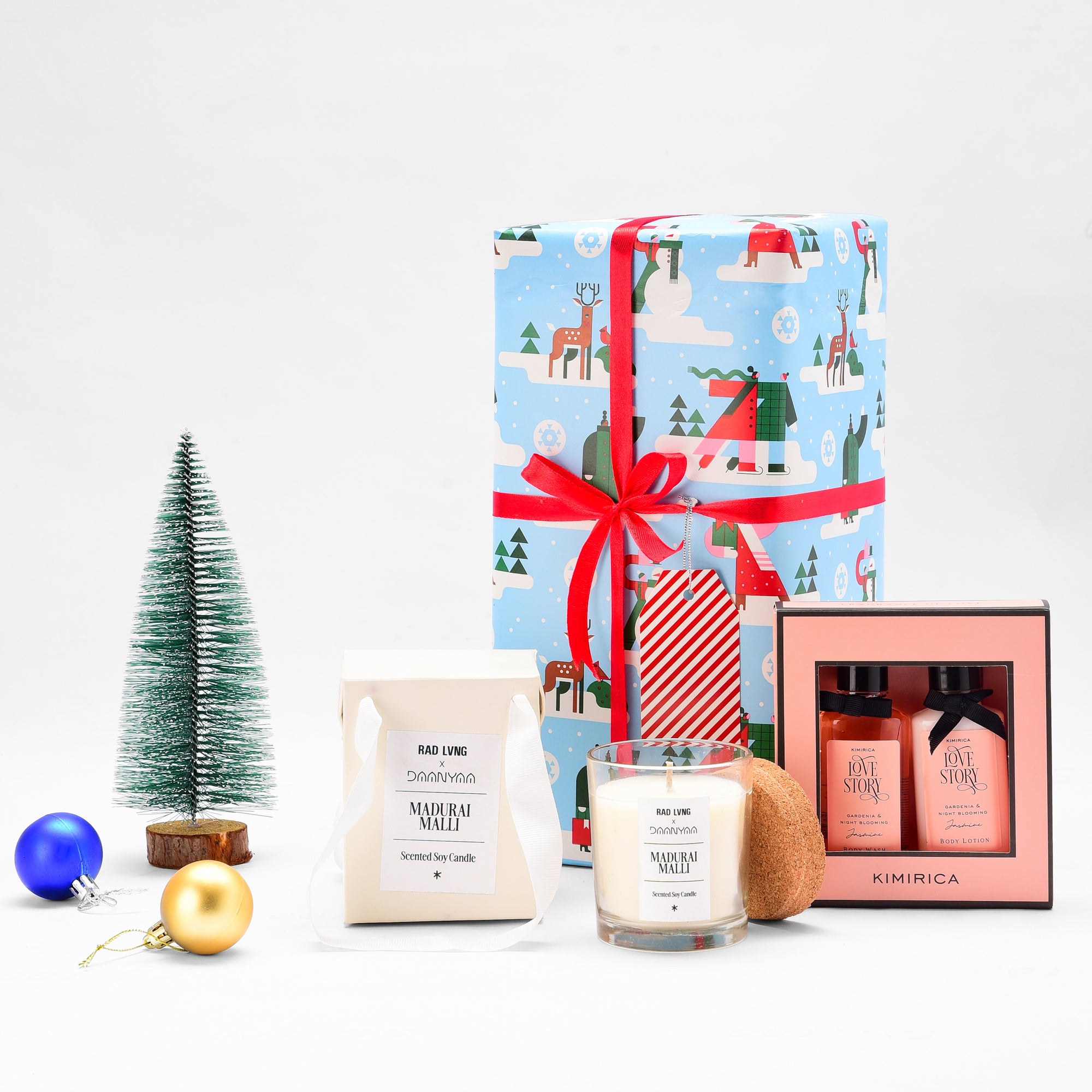 Designed for moments of pure indulgence, this hamper blends the soothing luxury of Kimirica’s Love Story set with the enchanting aroma of the Madurai Malli scented candle for a calming escape of jasmine, gardenia, and soft citrus.