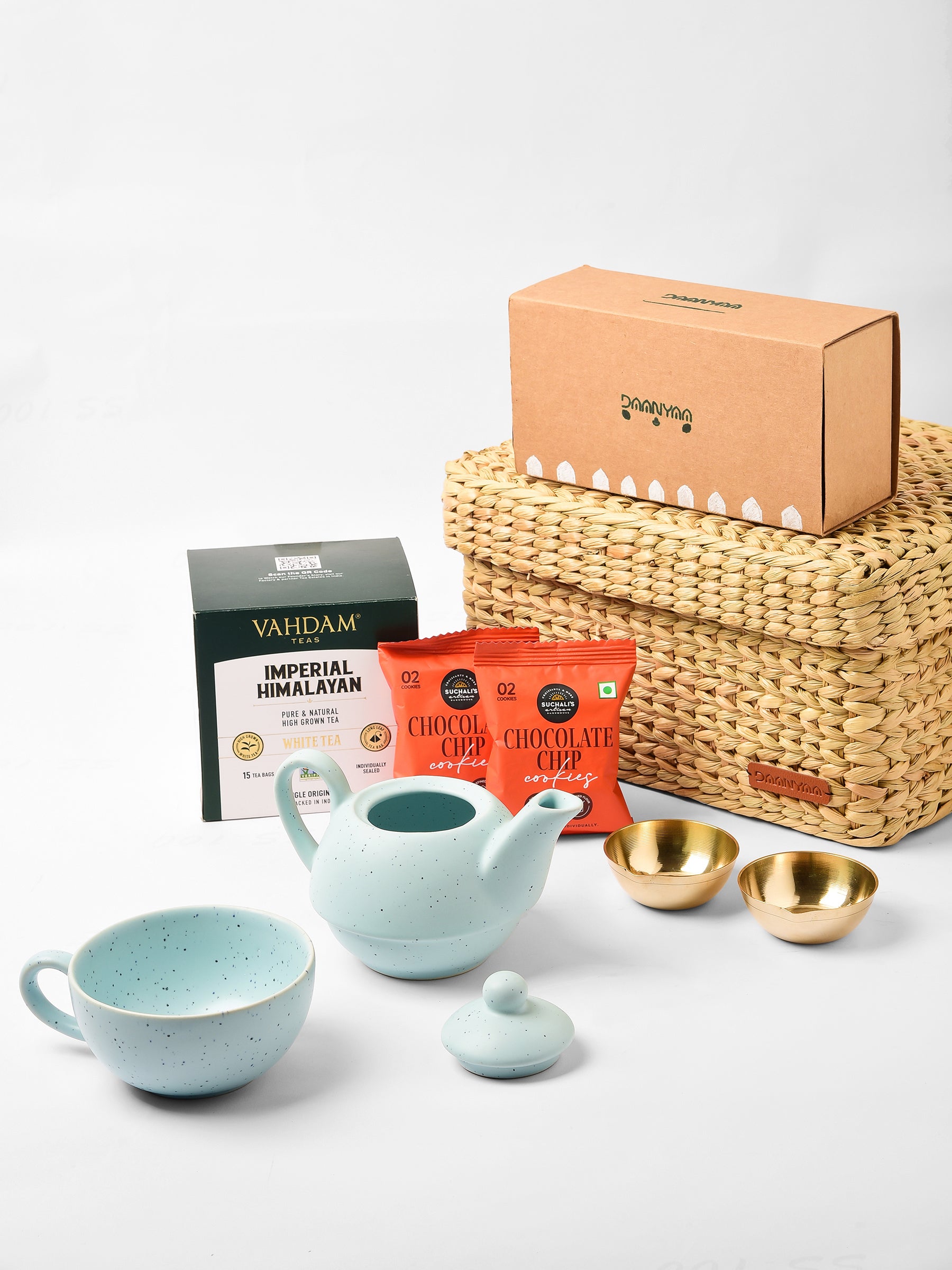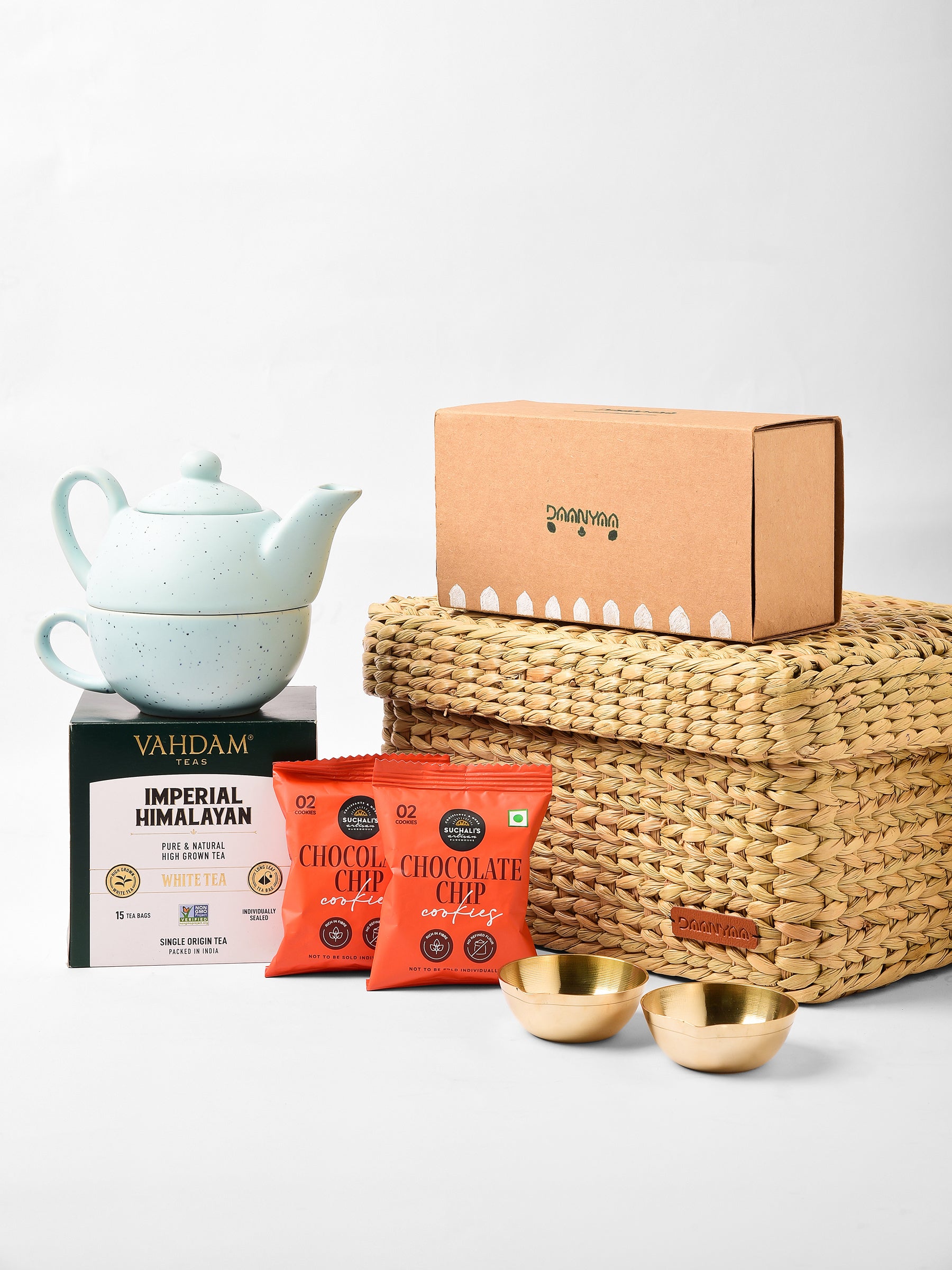 Net Quantity: 12 Units (1 Ceramic Kettle and Cup, 5 Chai Tea Bags, 2 Cookie Sachets, 2 Brass Diyas, 1 Seagrass Basket)