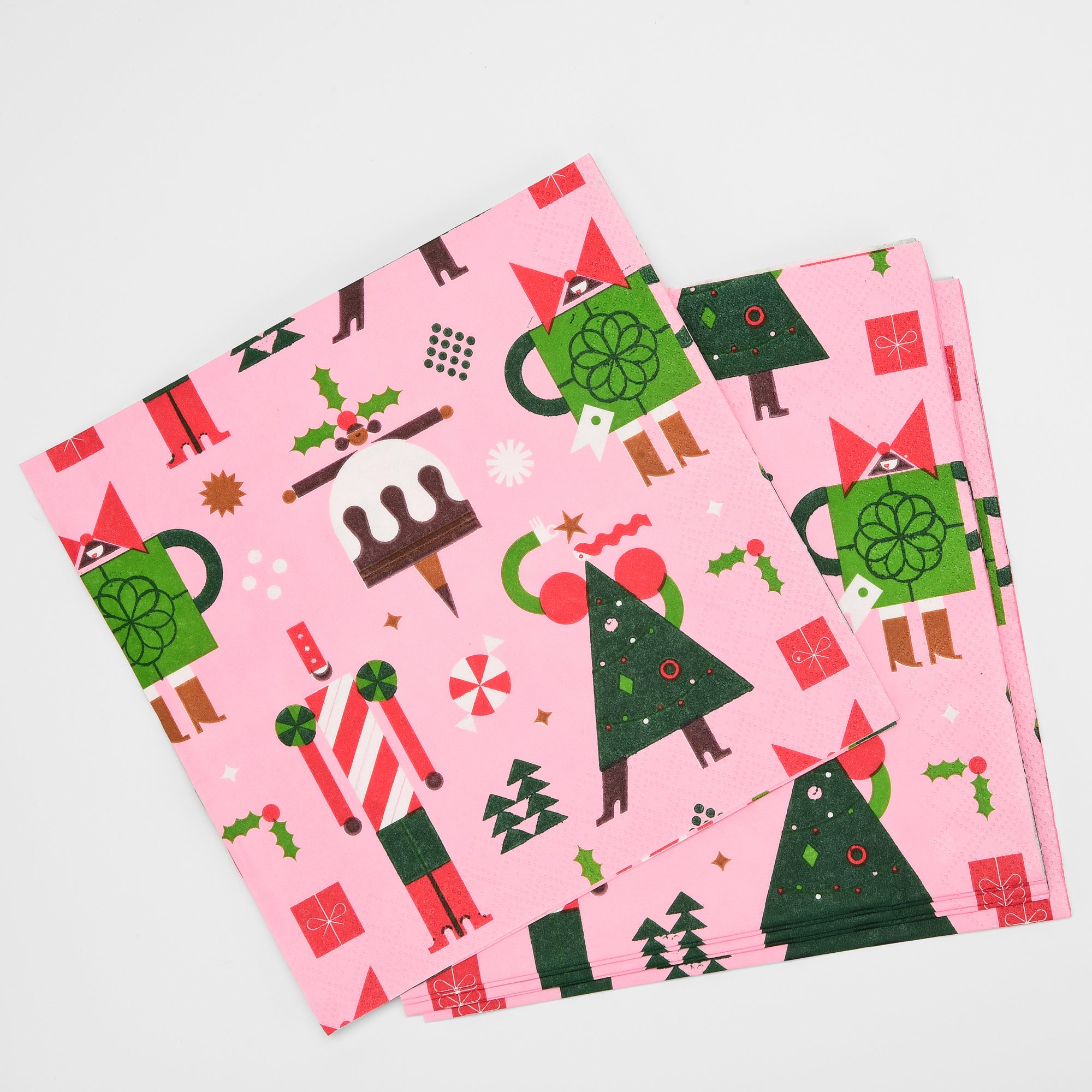 Festive Mixed Patterns: Includes Christmas trees, candy canes, puddings, mugs, and more in cheerful pink tones.