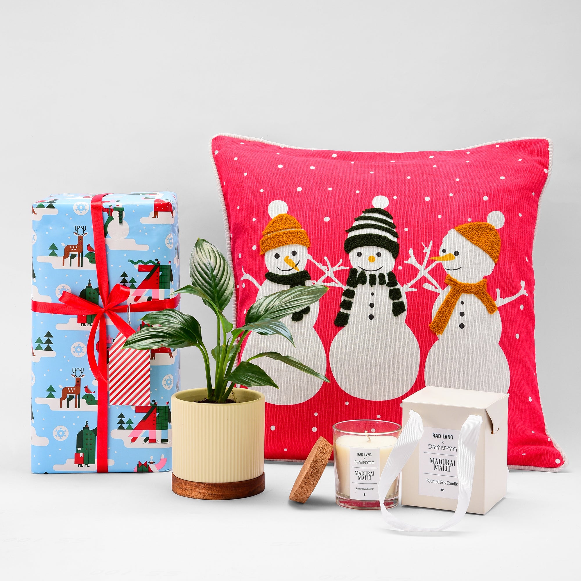 With a Madurai Malli candle, a ceramic planter on a wooden base, and an embroidered Christmas cushion cover, it creates an inviting, comforting nook for the holiday season.