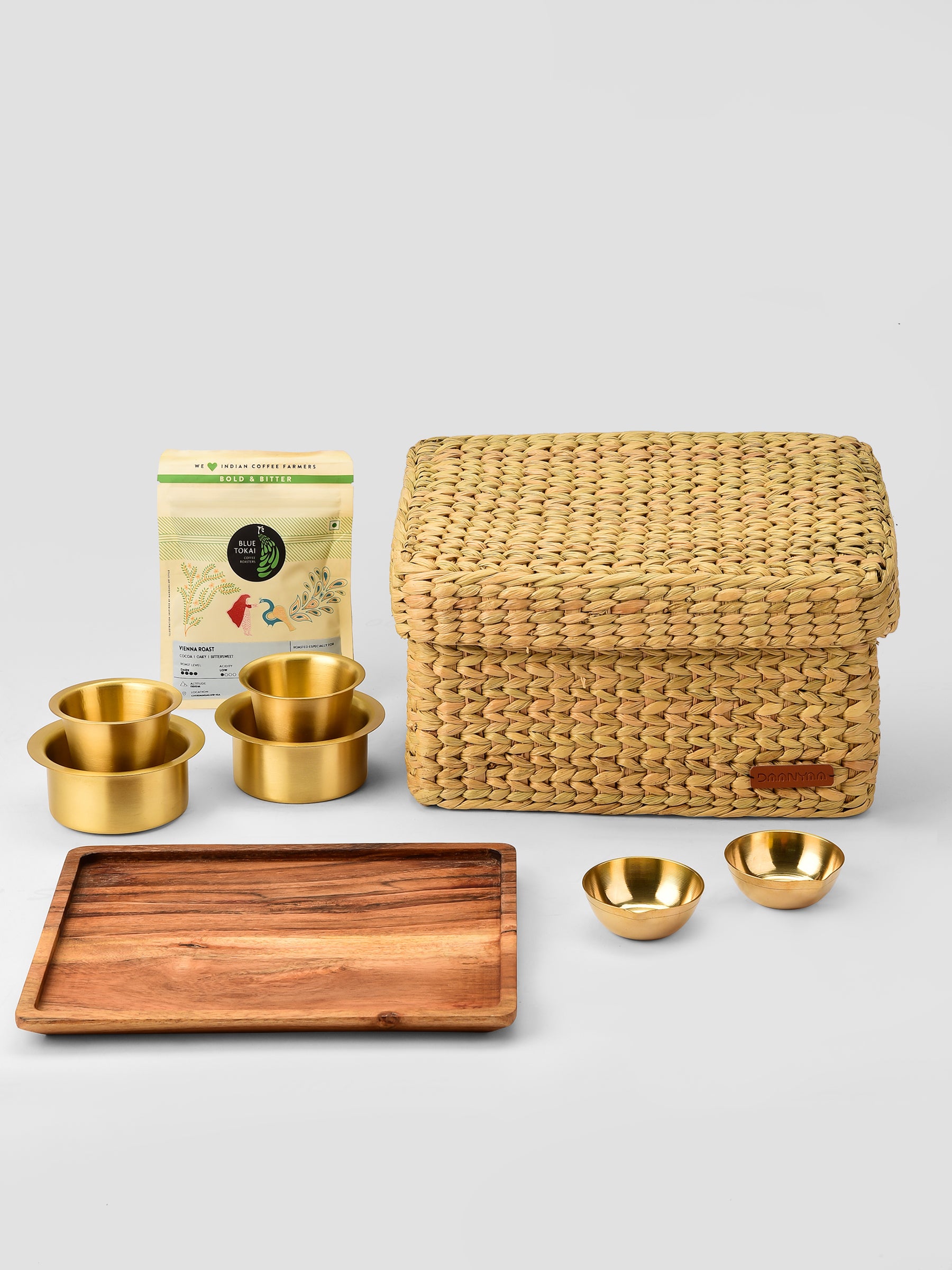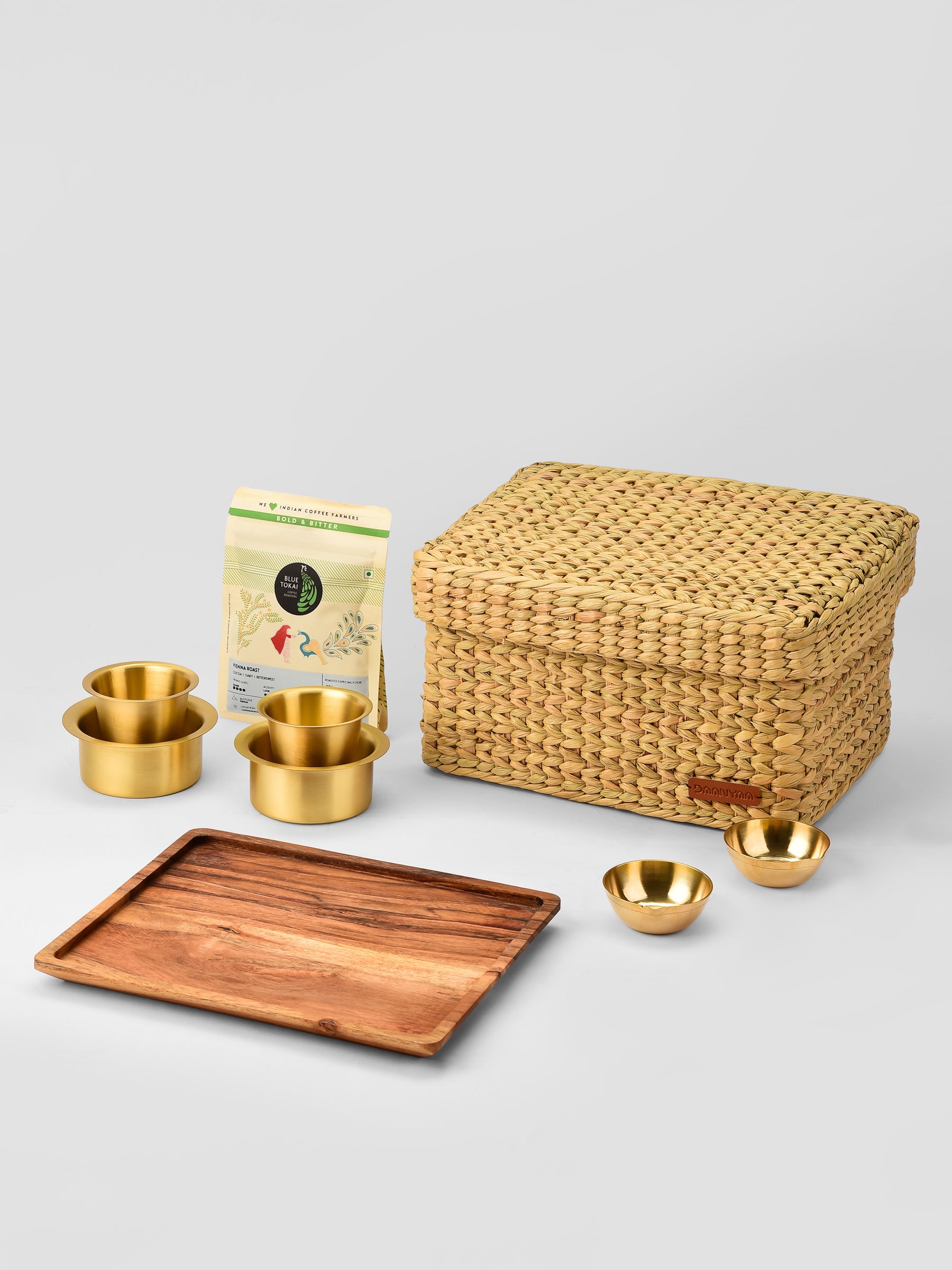 Net Quantity: 9 Units (Two Dabra and Two Tumblers, 1 Speciality Coffee Pack, Two Brass Diyas, One Wooden Tray, One Seagrass Basket)