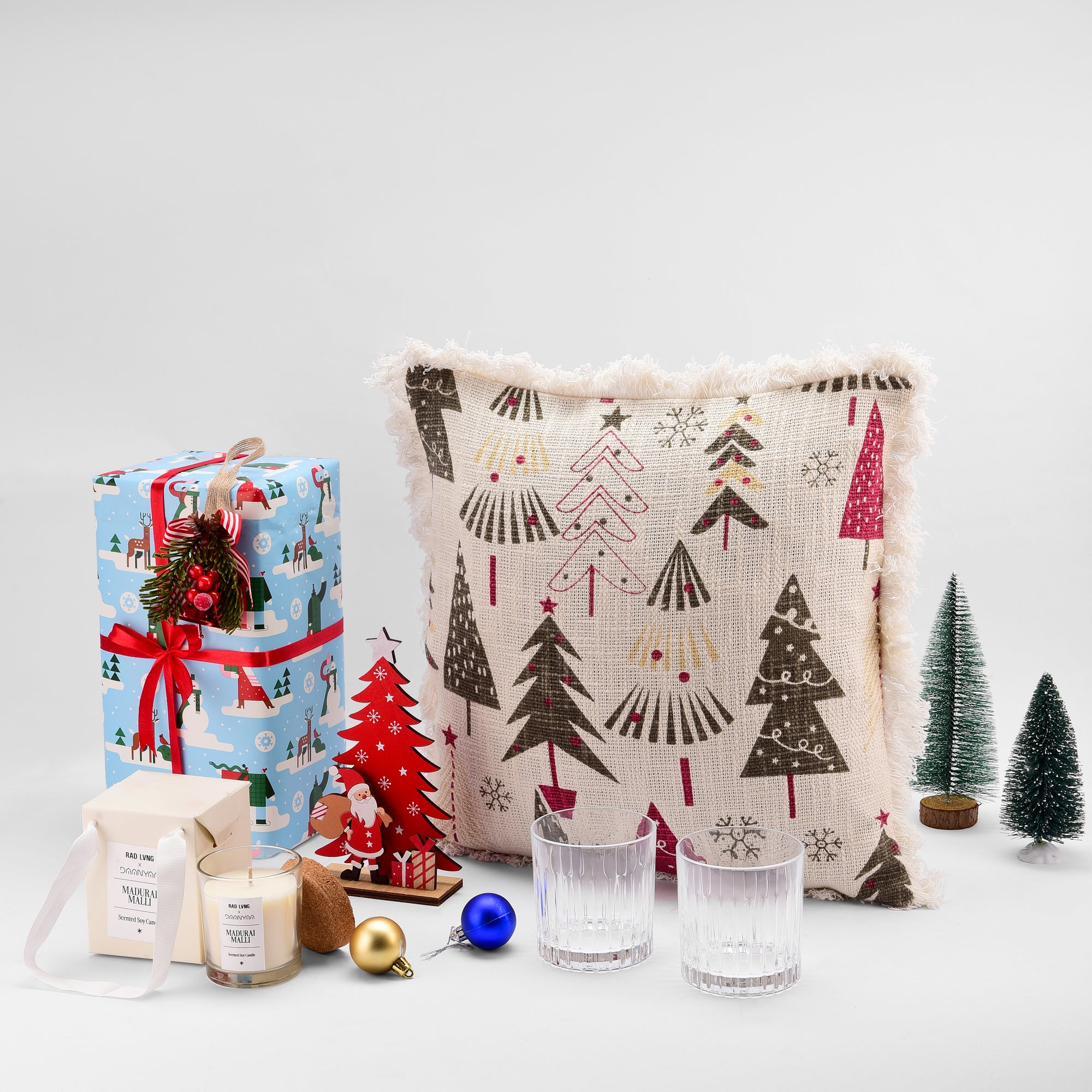 Net Quantity: 4 Units (Two Whiskey glasses, One Cushion cover, One Scented Candle)