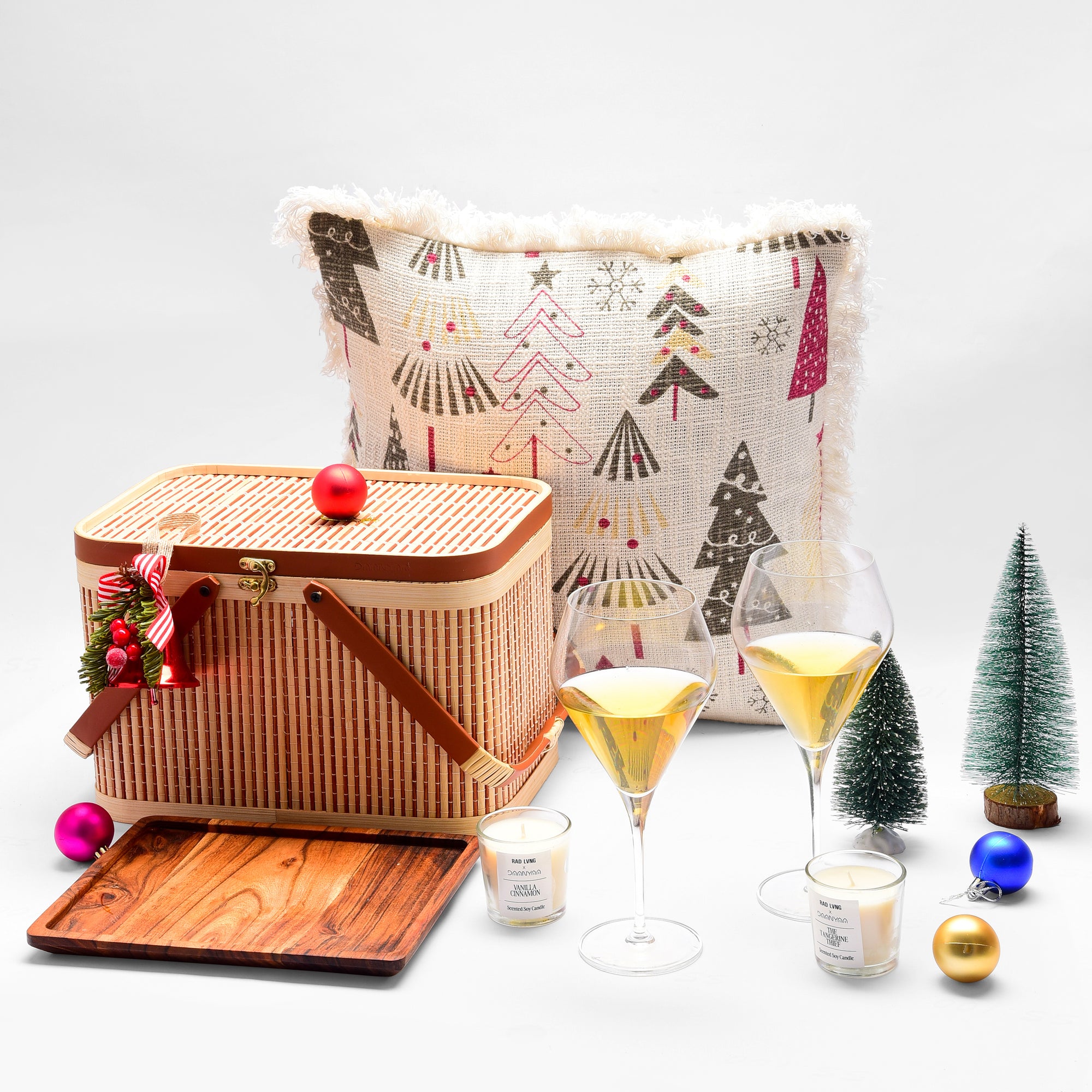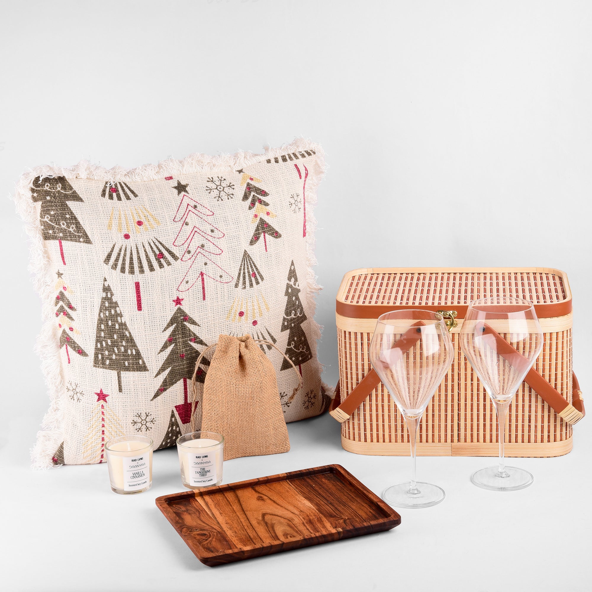 Elevate your gifting with this exquisite Daanyaa luxury hamper featuring elegant wine glasses, aromatic candles, festive cushion covers, a handcrafted acacia tray, and a stylish storage basket—thoughtfully curated to blend aesthetic charm with practical utility.