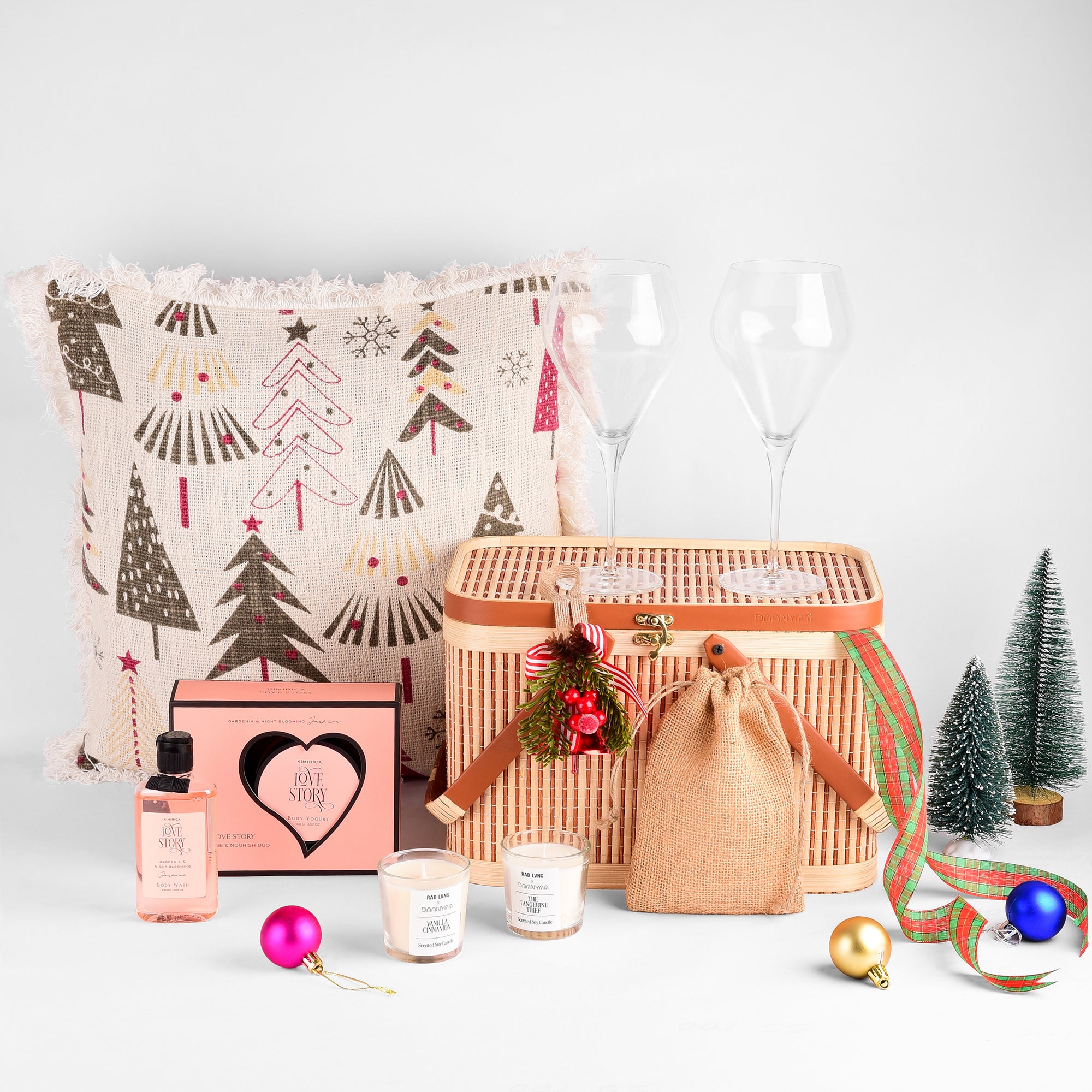 Celebrate the festive season with a hamper that blends comfort, indulgence, and holiday charm, featuring crystal-style wine glasses, soothing natural-wax candles, and a handcrafted Christmas cushion cover for cozy evenings and elegant holiday toasts.