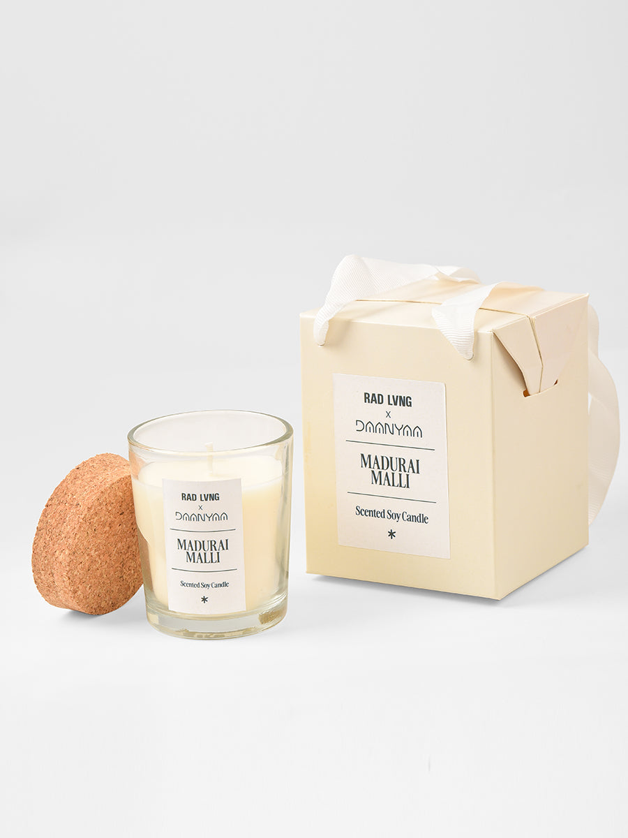 Madurai Malli Scented Candle The enchanting aroma of Indian Jasmine, accented with warm citrus and subtle frangipani. Creates an invigorating, comforting fragrance. Natural soy wax with a burn time that lasts.