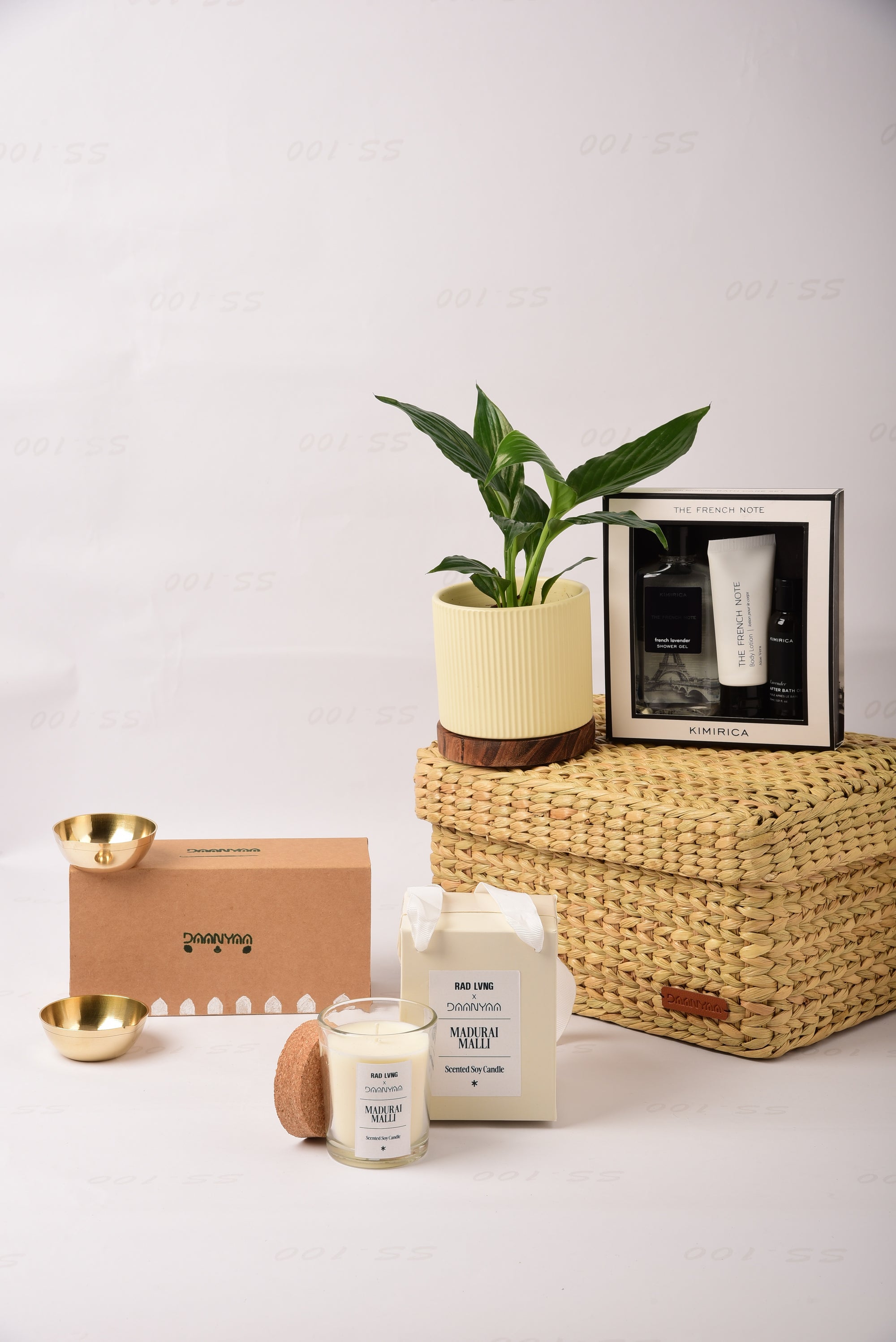 Net Quantity: 8 Units (Three Bath & Body Products, One Ceramic Planter, One Planter Base, One Scented Candle, Two Brass Diyas, One Seagrass Basket)
