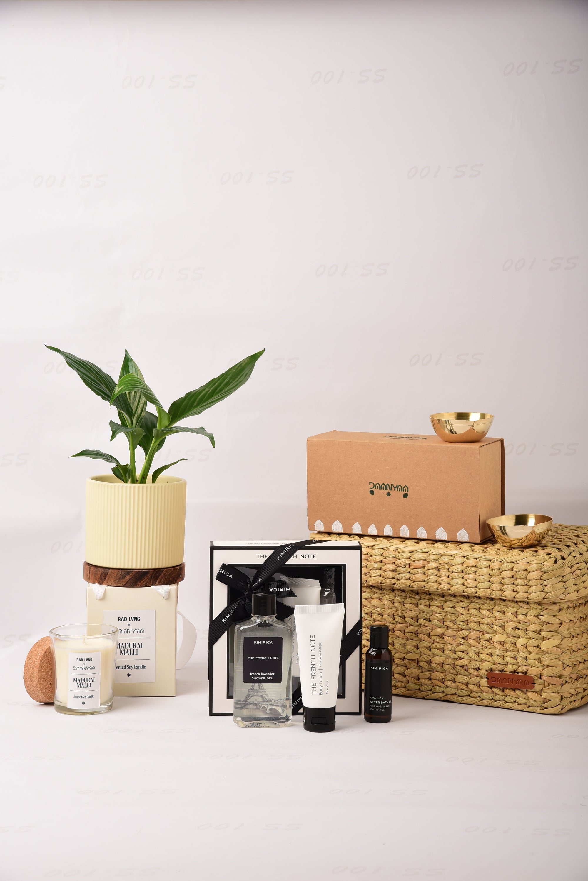 A thoughtfully curated hamper for him to unwind. Featuring French inspired bath care essentials, handcrafted home accents, and a cool planter that bring in a sense of ease and balance. Perfect for a quick reset.