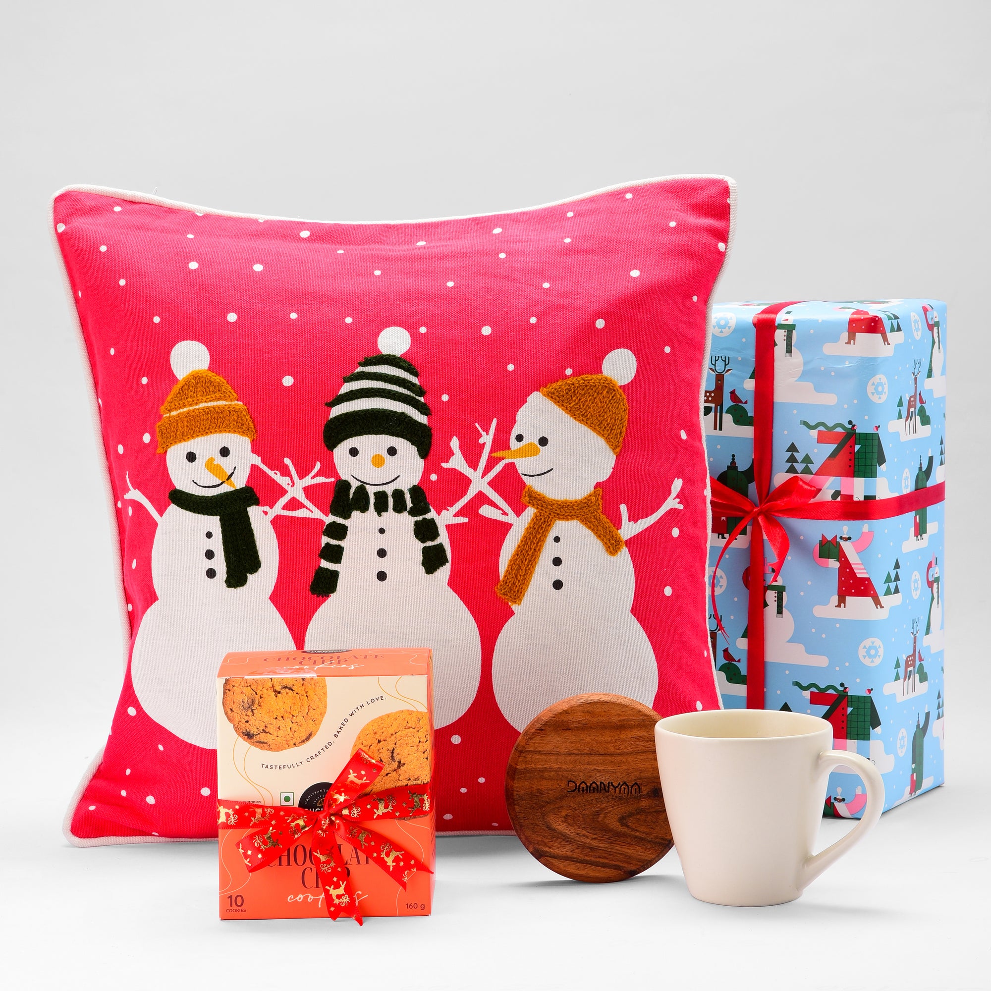 A comforting blend of everyday favorites, this hamper pairs a consciously crafted tall ceramic mug with beautifully handcrafted acacia wood coaster for an inviting, cozy ritual. The Christmas-themed embroidered cushion cover adds a soft festive charm, completing the nook. Finished with Suchali’s wholesome cookies—chewy, crunchy, and delightfully guilt-free—it’s the perfect companion for slow mornings and relaxed evenings.
