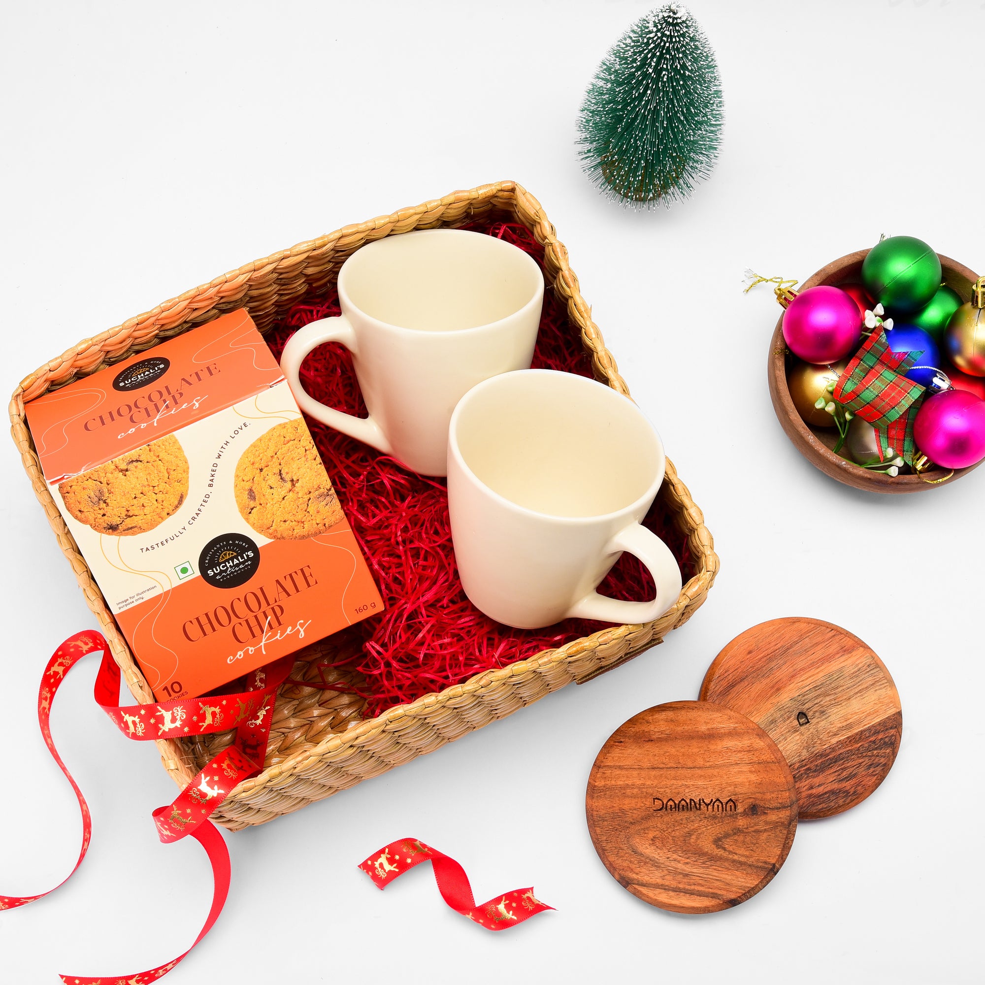 Illuminate your space with elegance through the Daanyaa Mug Club Christmas Hamper featuring two handcrafted ceramic mugs, acacia wooden coasters, chocolate cookies, and a handwoven seagrass basket that blends artistry with functionality.