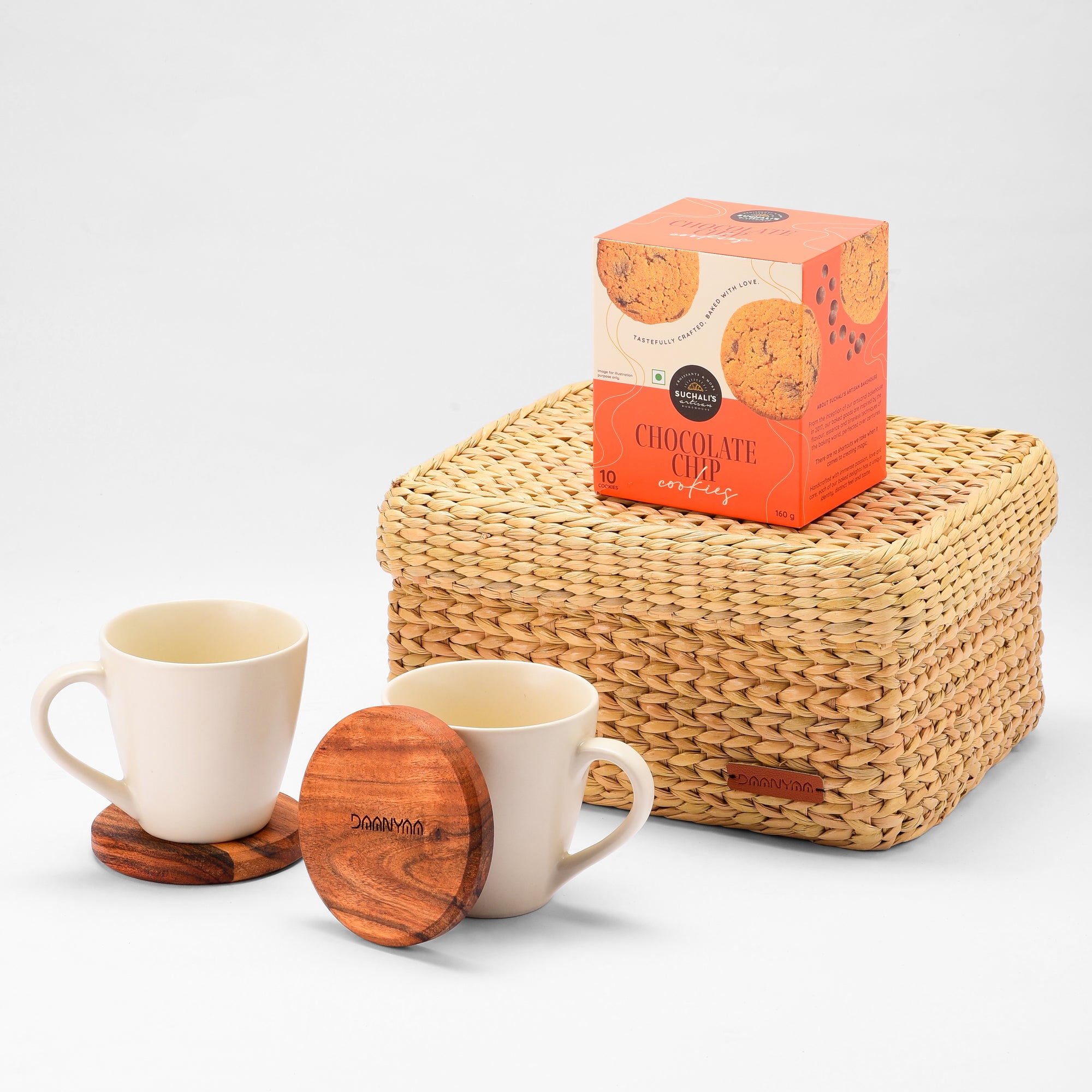 Net Quantity: 6 Units (Two tall mugs, Two wooden coasters, One cookie box, One seagrass basket)