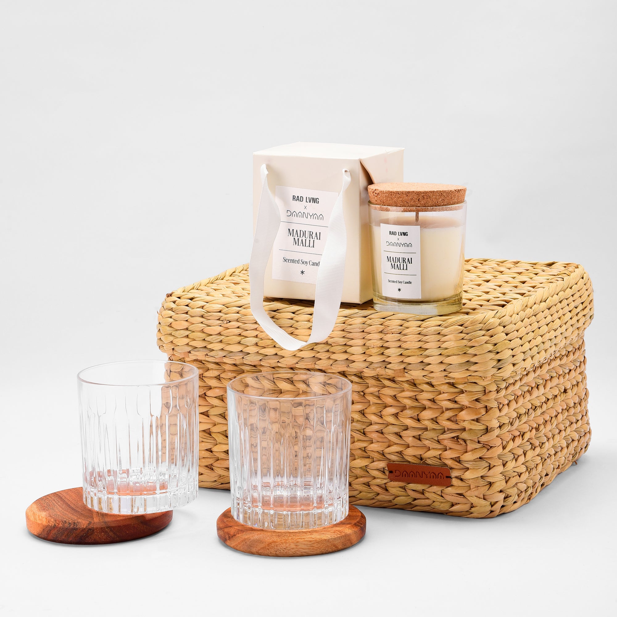 Net Quantity: 6 Units (Two Whiskey Glasses, Two Wooden Coasters, One Scented Candle, and One Seagrass Basket)