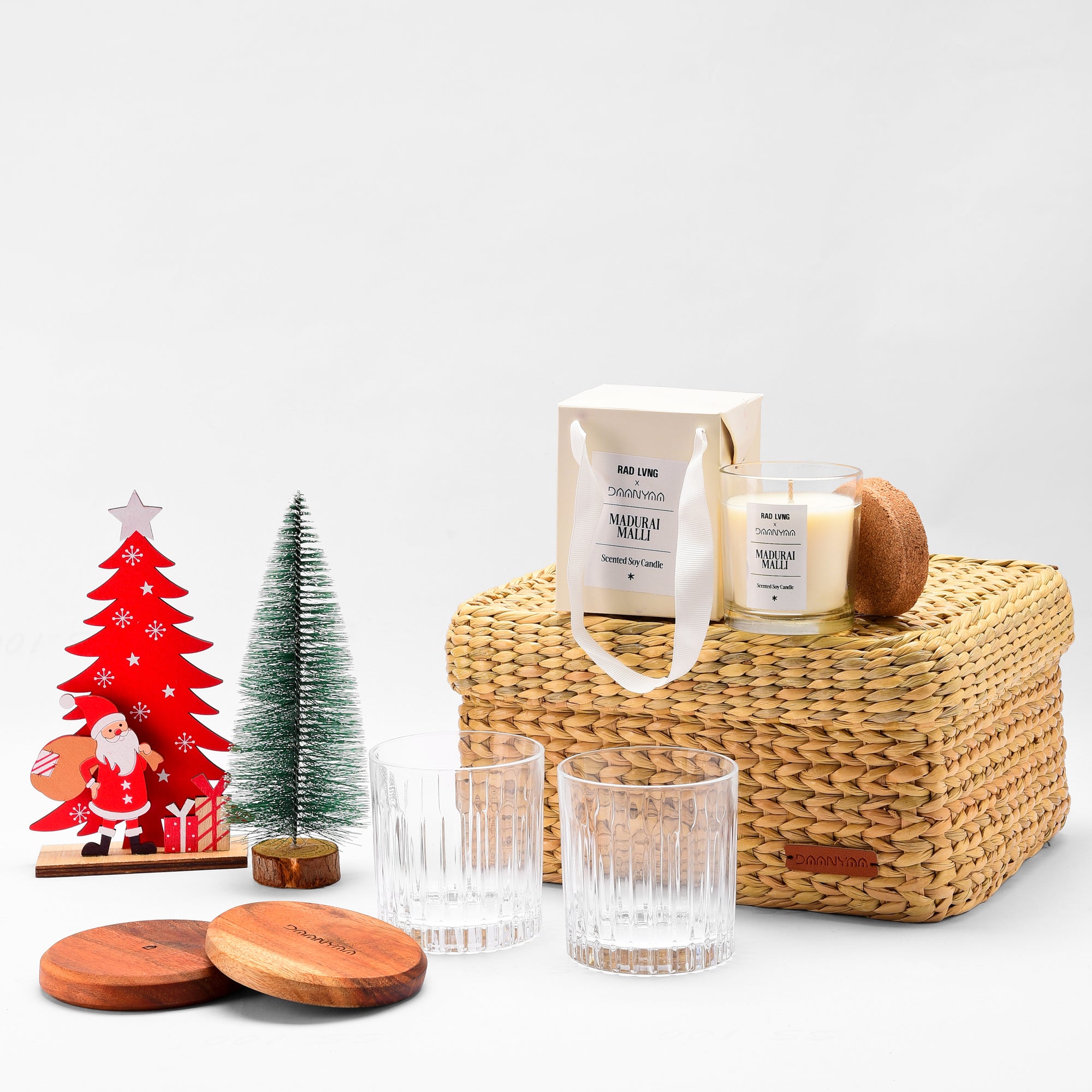 Celebrate the season with warmth and refinement through this premium Daanyaa hamper, curated for whiskey lovers and décor enthusiasts with crystal-style glassware, natural wooden accents, and the calming glow of a jasmine-scented candle.