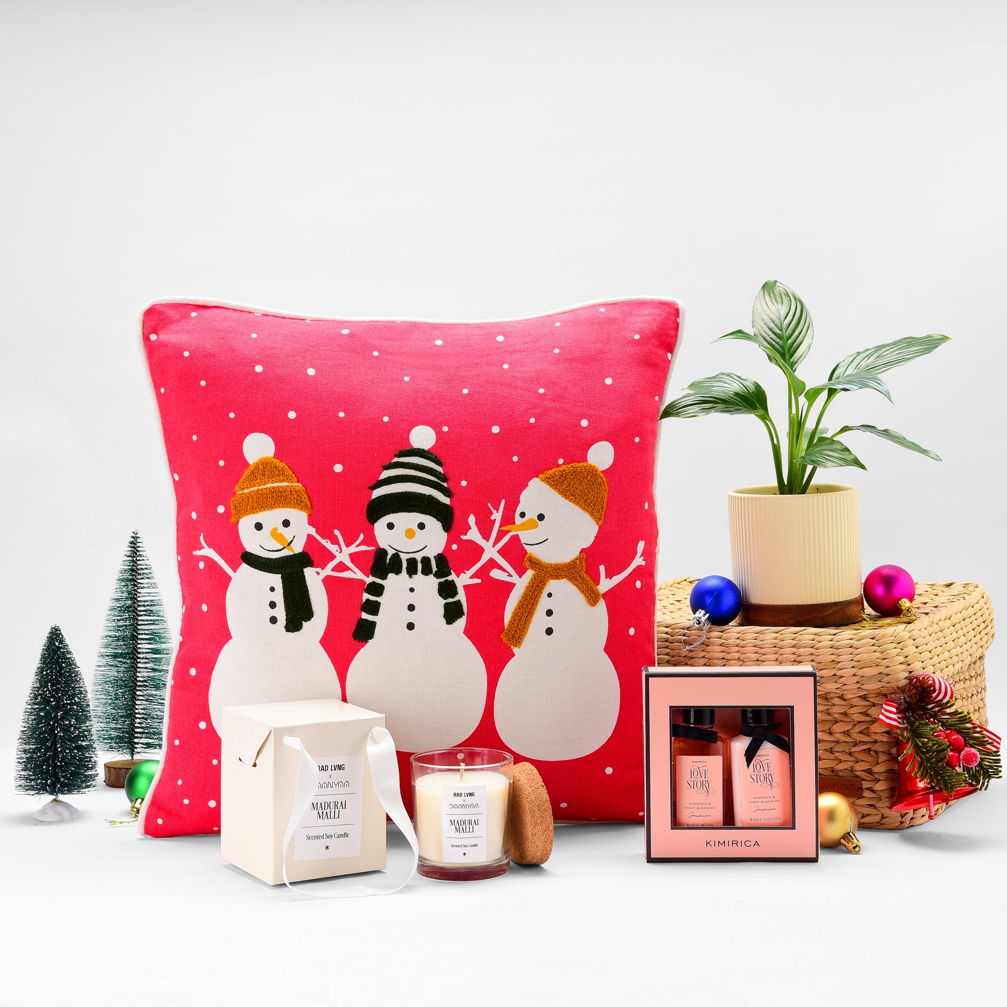 Elevate your gifting with this luxurious Daanyaa hamper featuring a spa-like Kimirica bath set, a soothing scented candle, a cream-coloured planter, and a festive Christmas cushion cover, all beautifully arranged in an elegant seagrass basket.