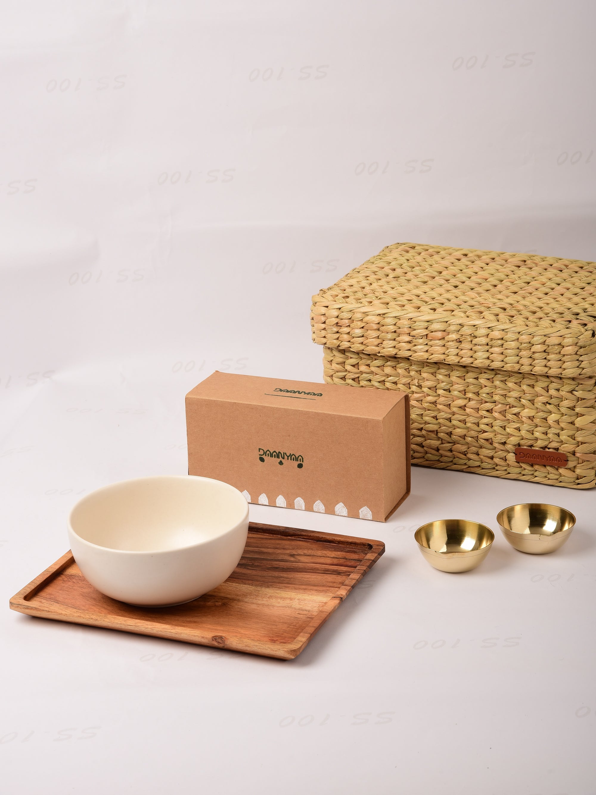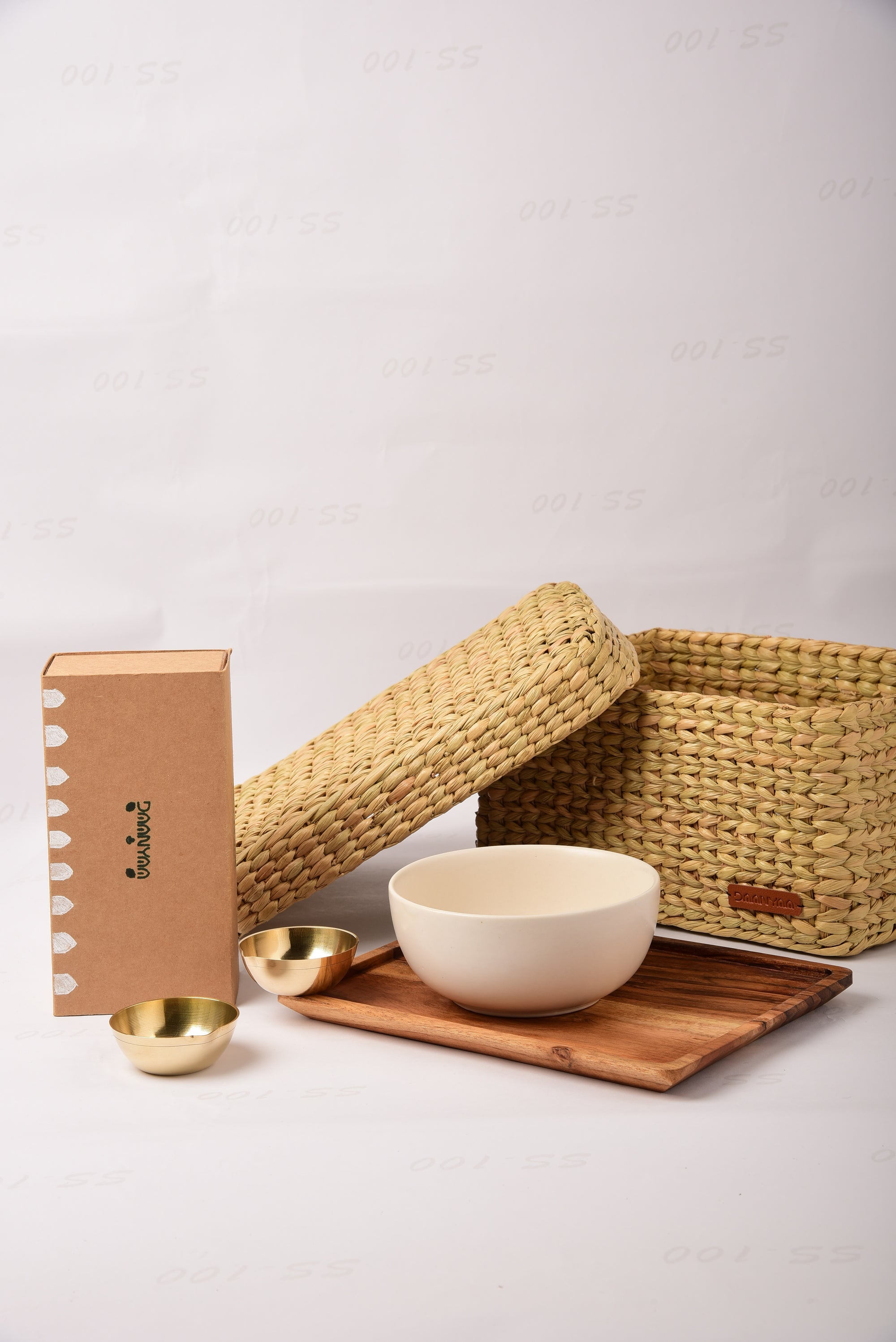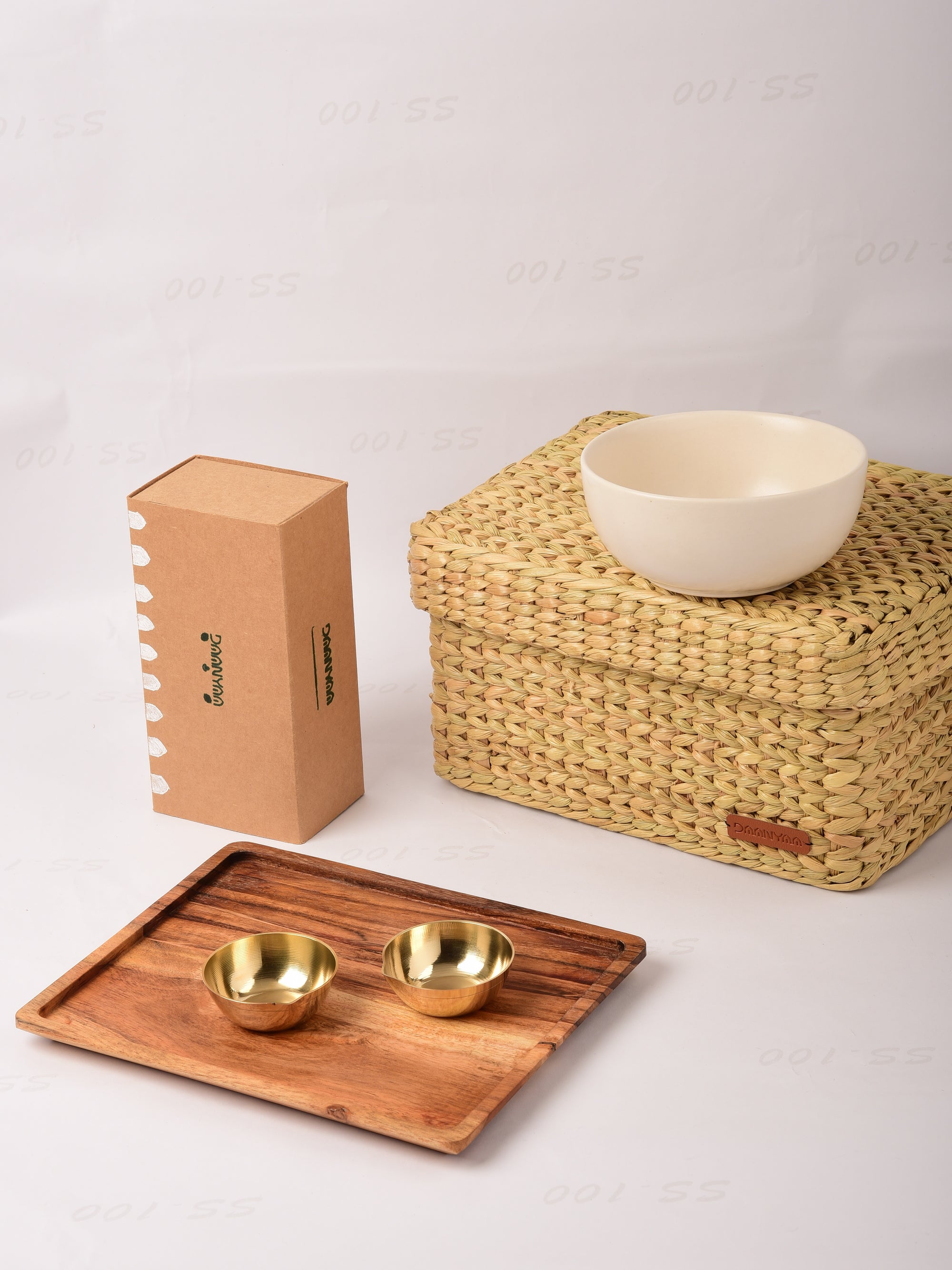 Net Quantity: 5 Units (One Wooden Tray, One Ceramic Bowl, Two Brass Diyas, One Seagrass Basket)