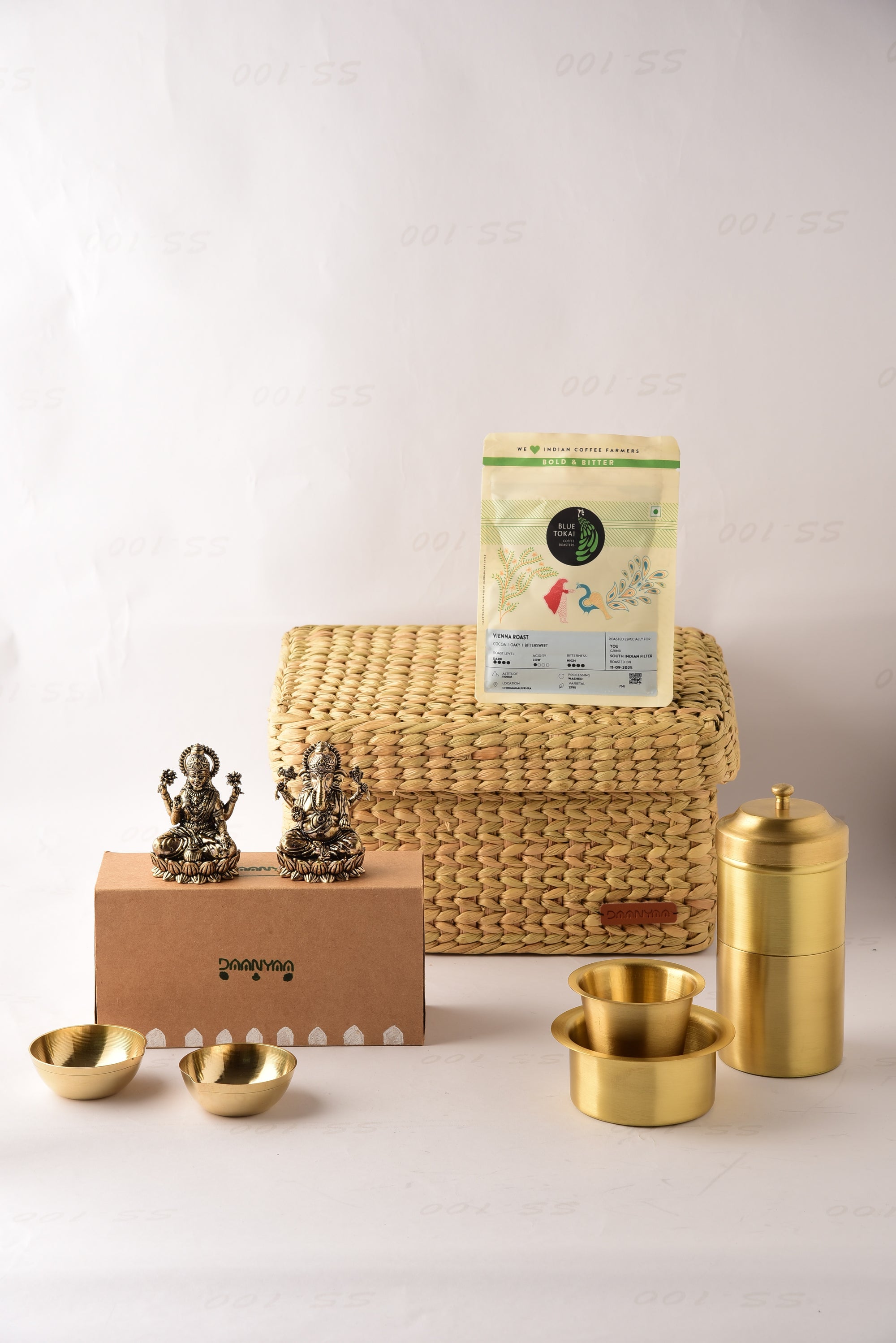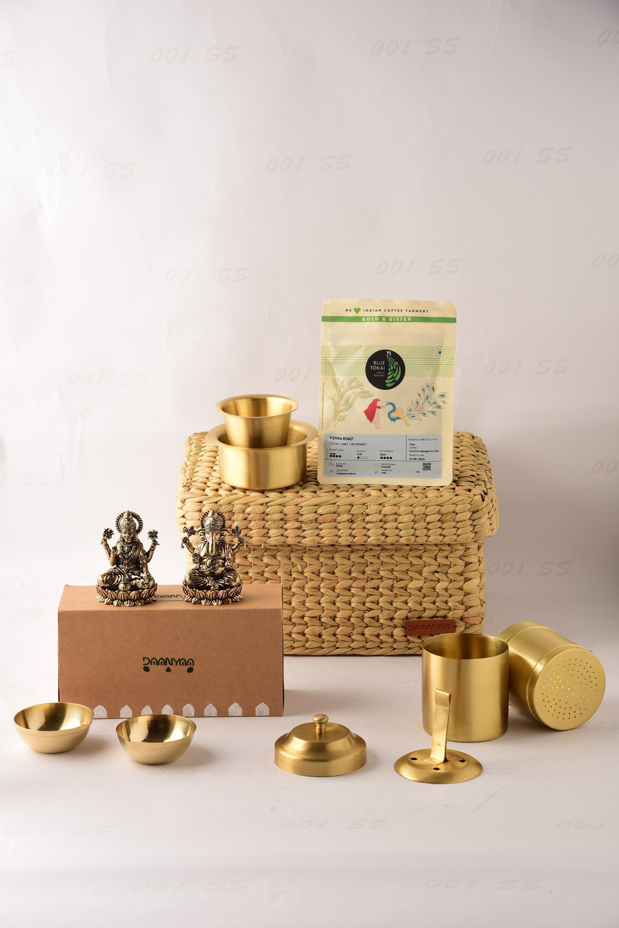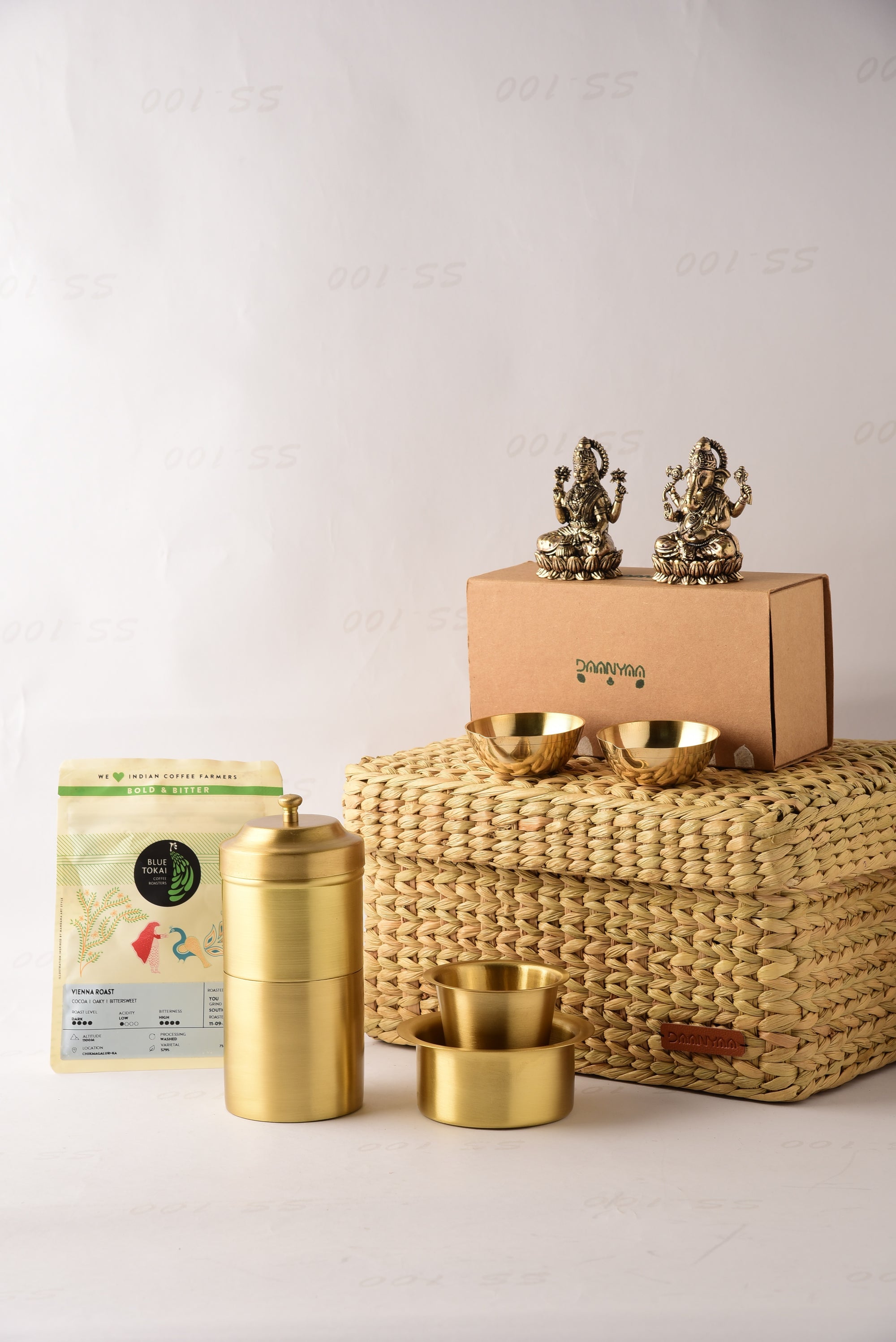 Net Quantity: 10 Units (One Dabara Katori, One Dabara Glass, One Coffee Filter, Two Brass Statues, Five Coffee Packs, Two Brass Diyas, One Seagrass Basket)
