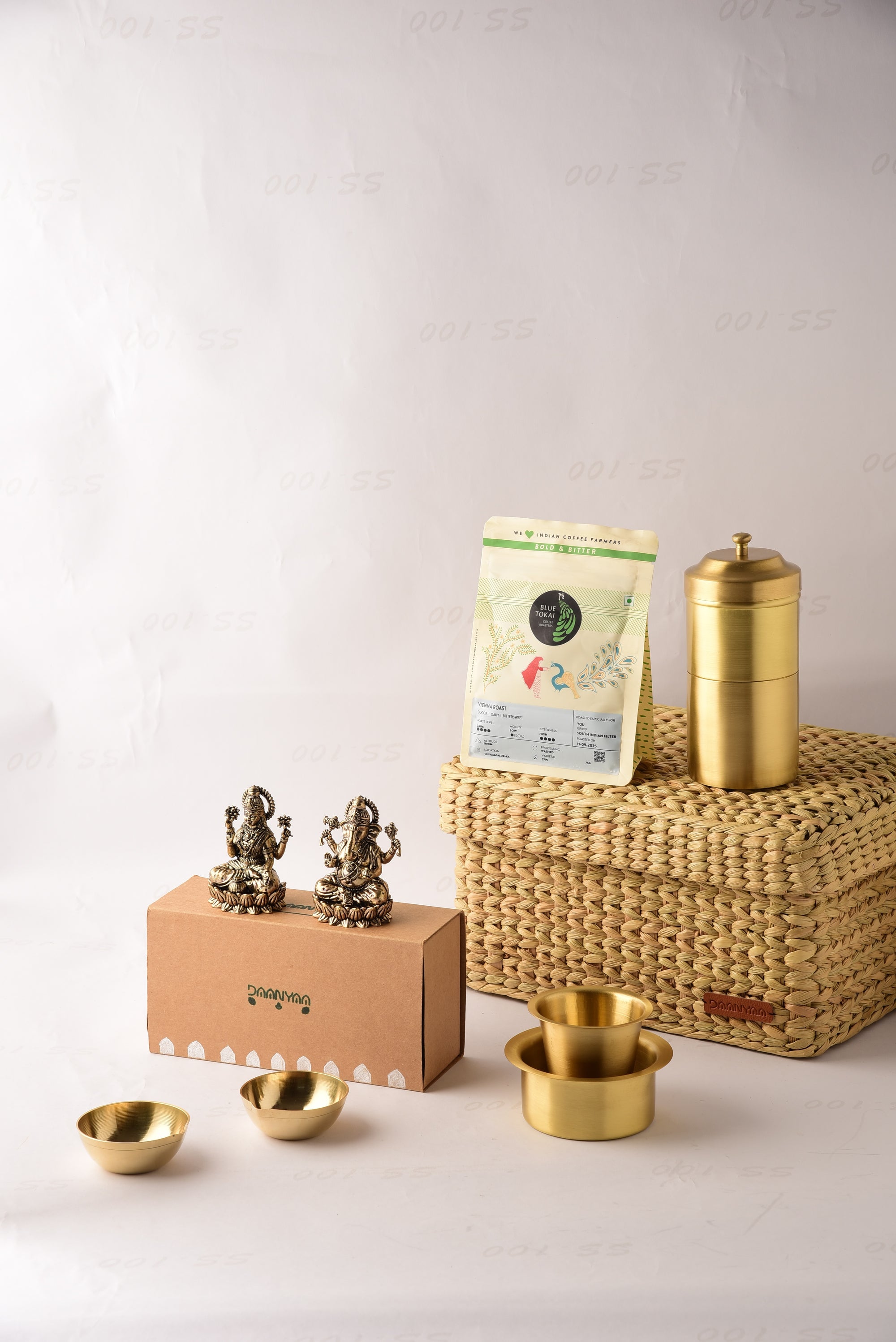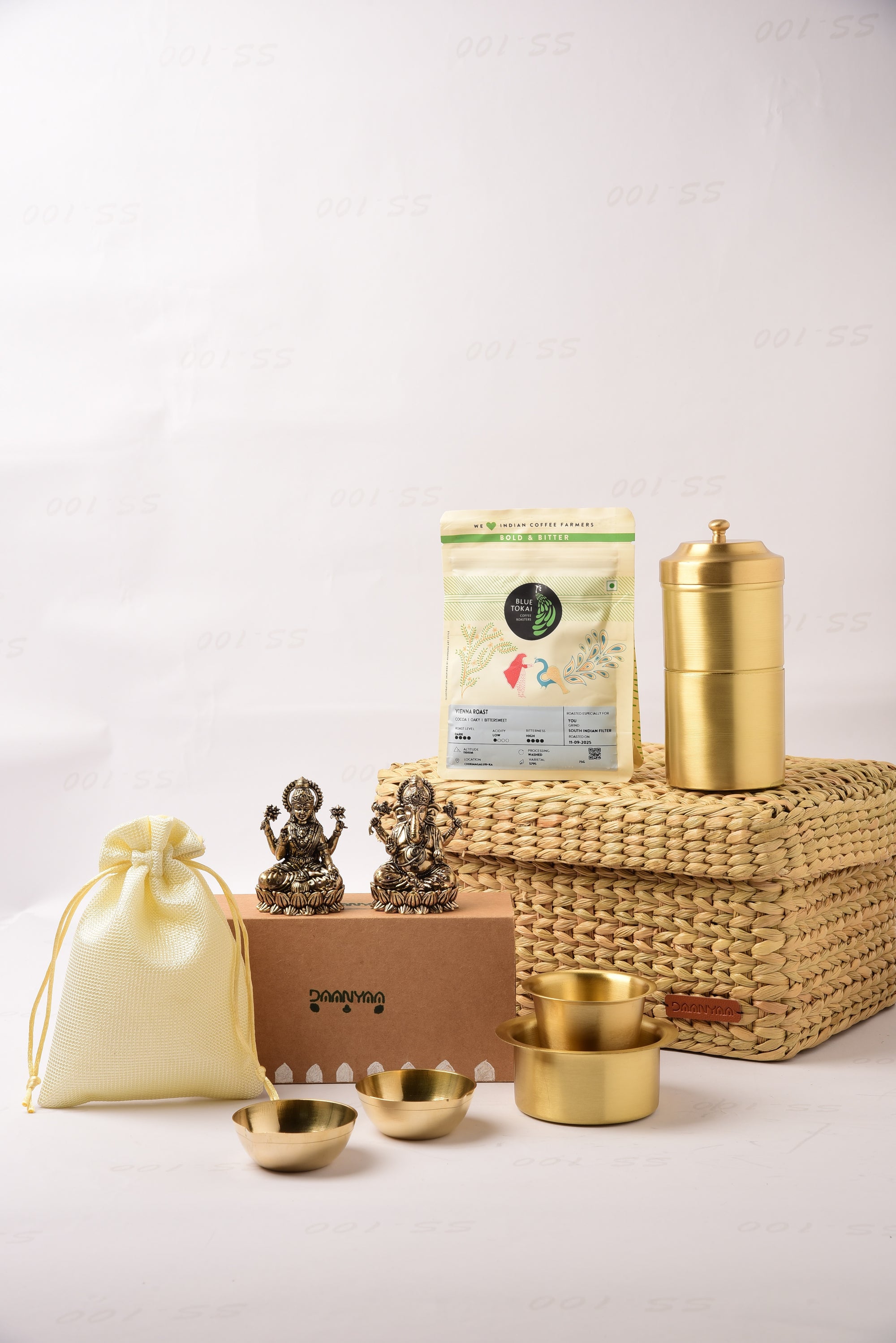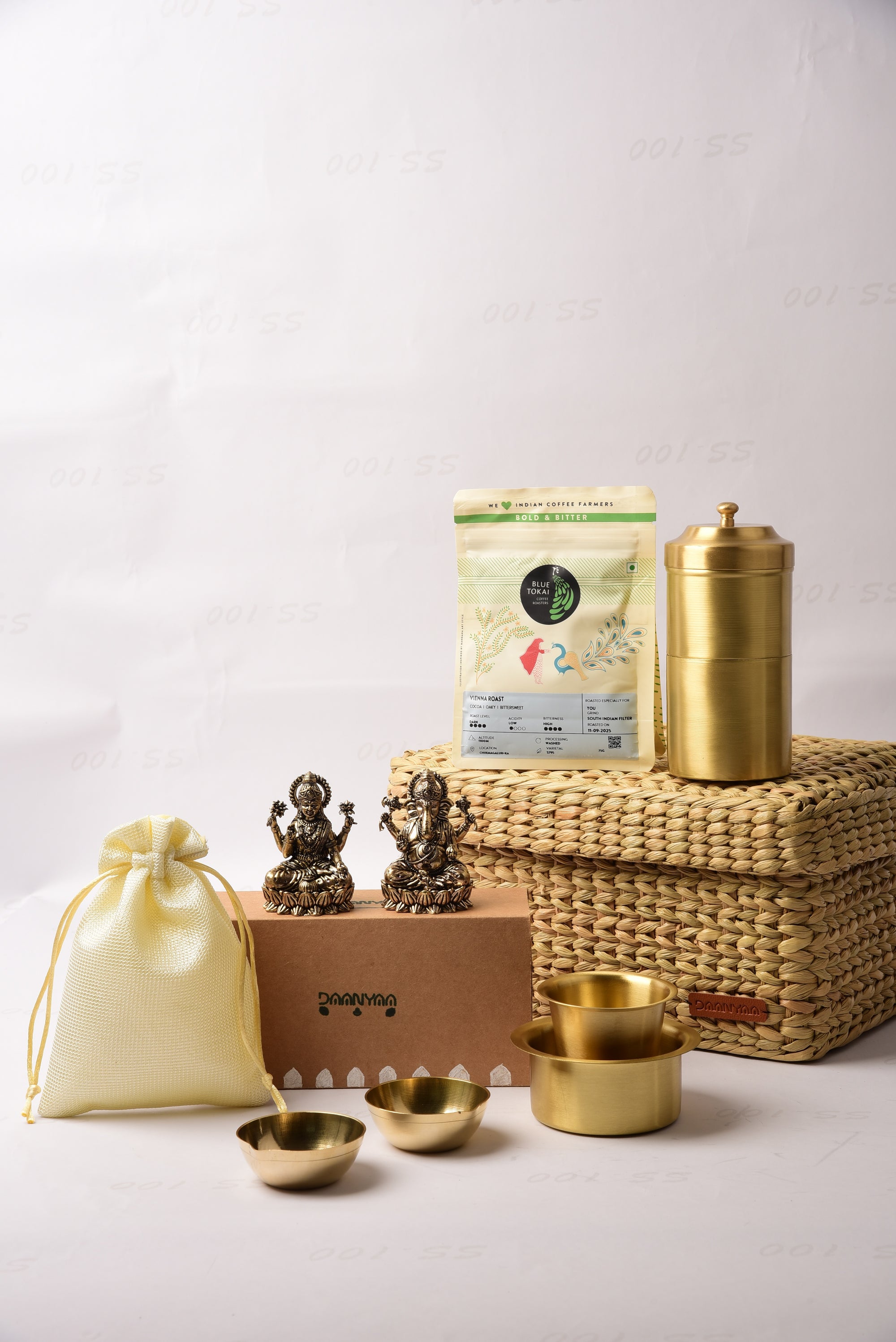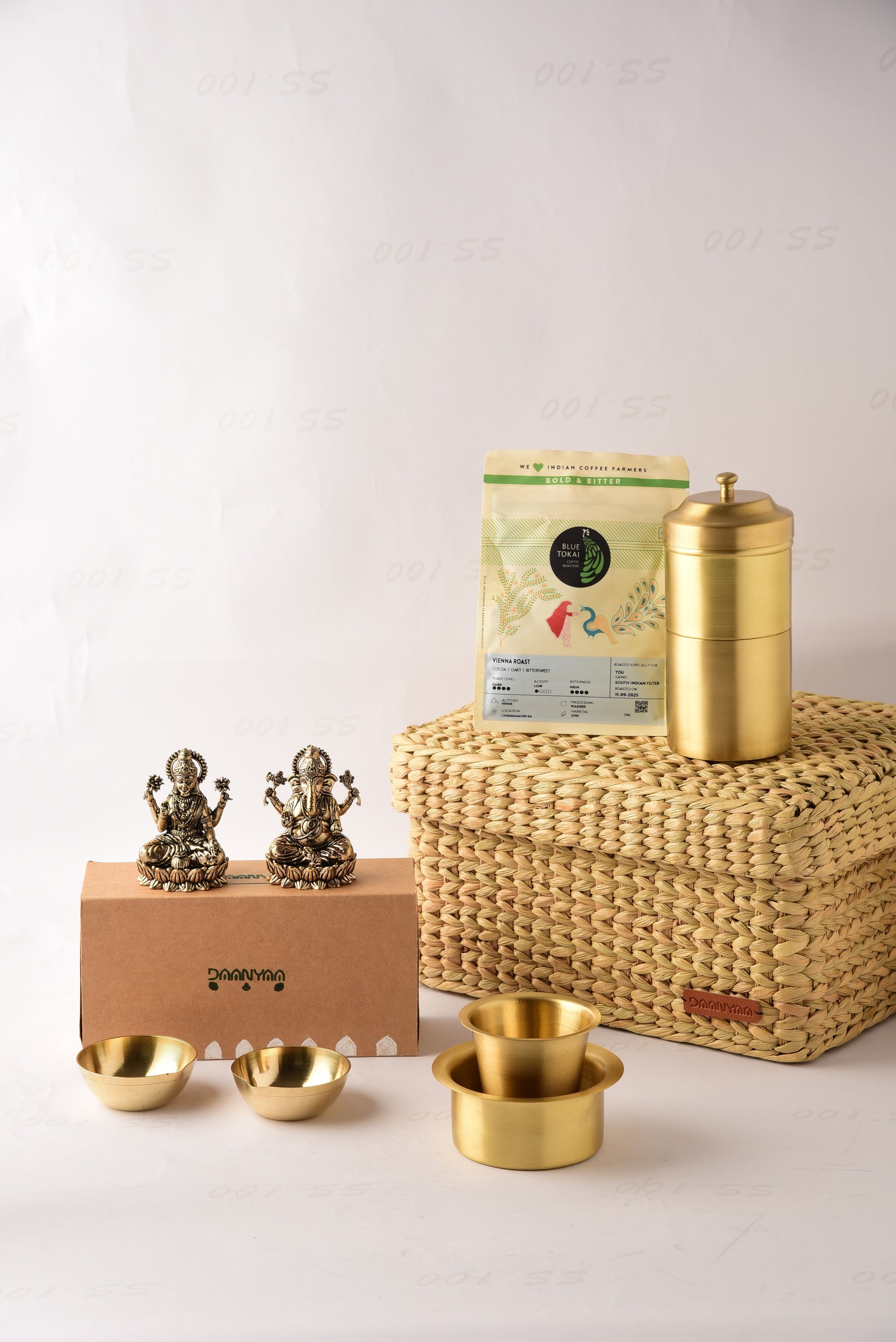 Net Quantity: 10 Units (One Dabara Katori, One Dabara Glass, One Coffee Filter, Two Brass Statues, Five Coffee Packs, Two Brass Diyas, One Seagrass Basket)