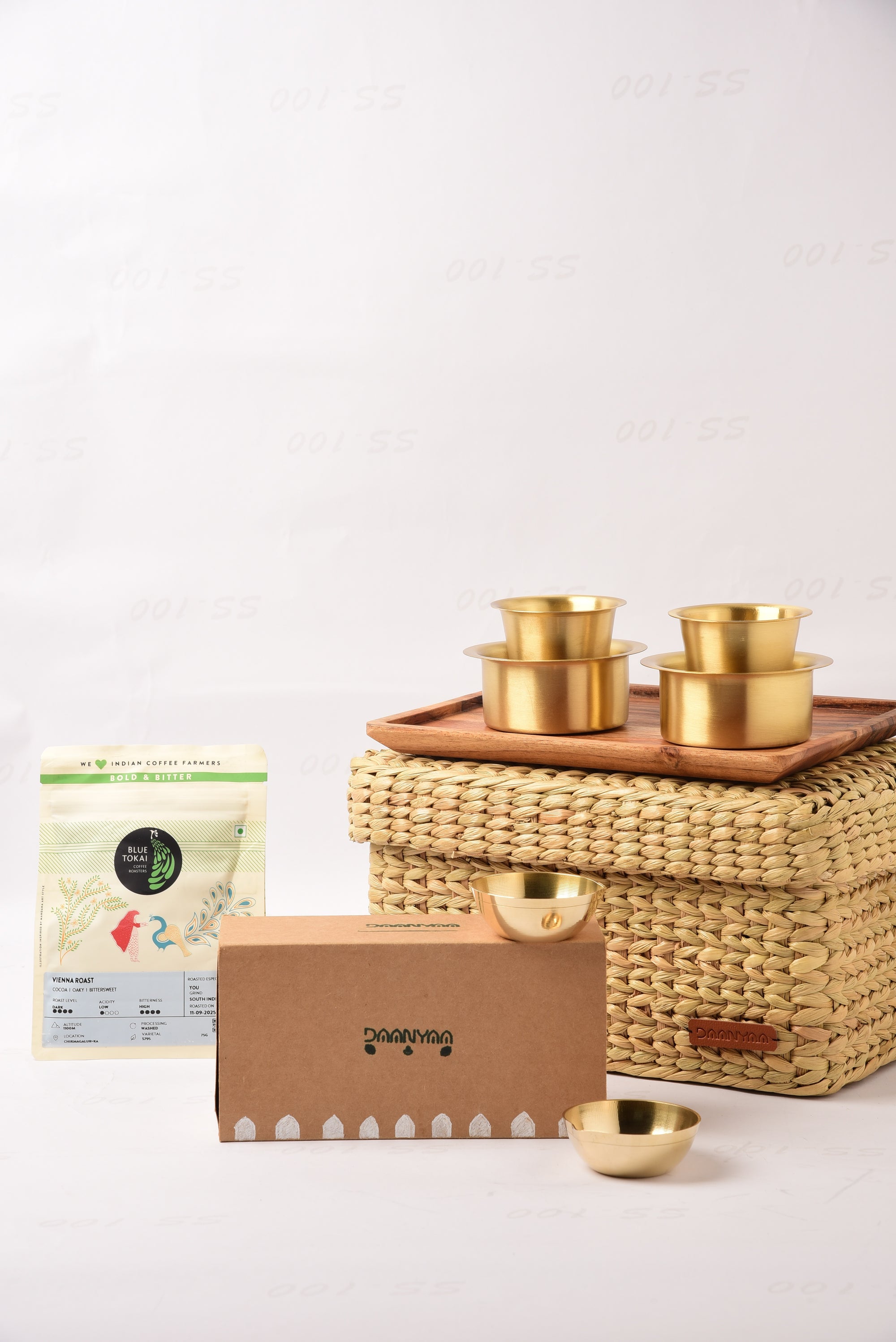Net Quantity: 9 Units (One Dabara Katori, One Dabara Glass, Five Coffee Packs, Two Brass Diyas, One Wooden Tray, One Seagrass Basket)